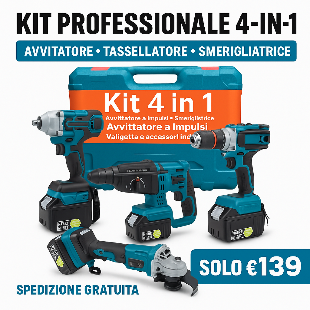 Il Kit Utensili Elettrici 4 in 1 è la soluzione ideale per chi desidera un set completo di strumenti potenti e versatili per il lavoro quotidiano.