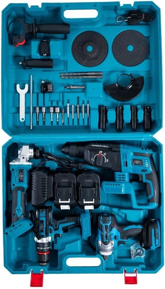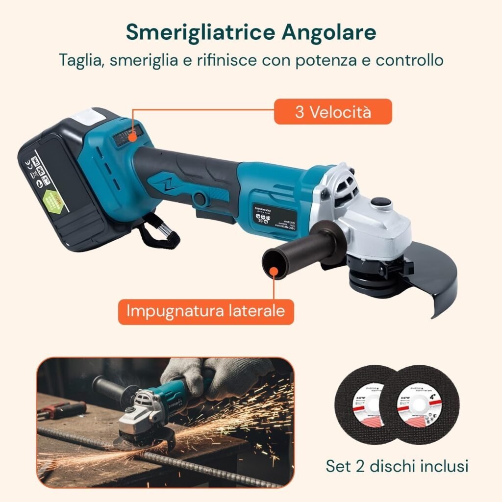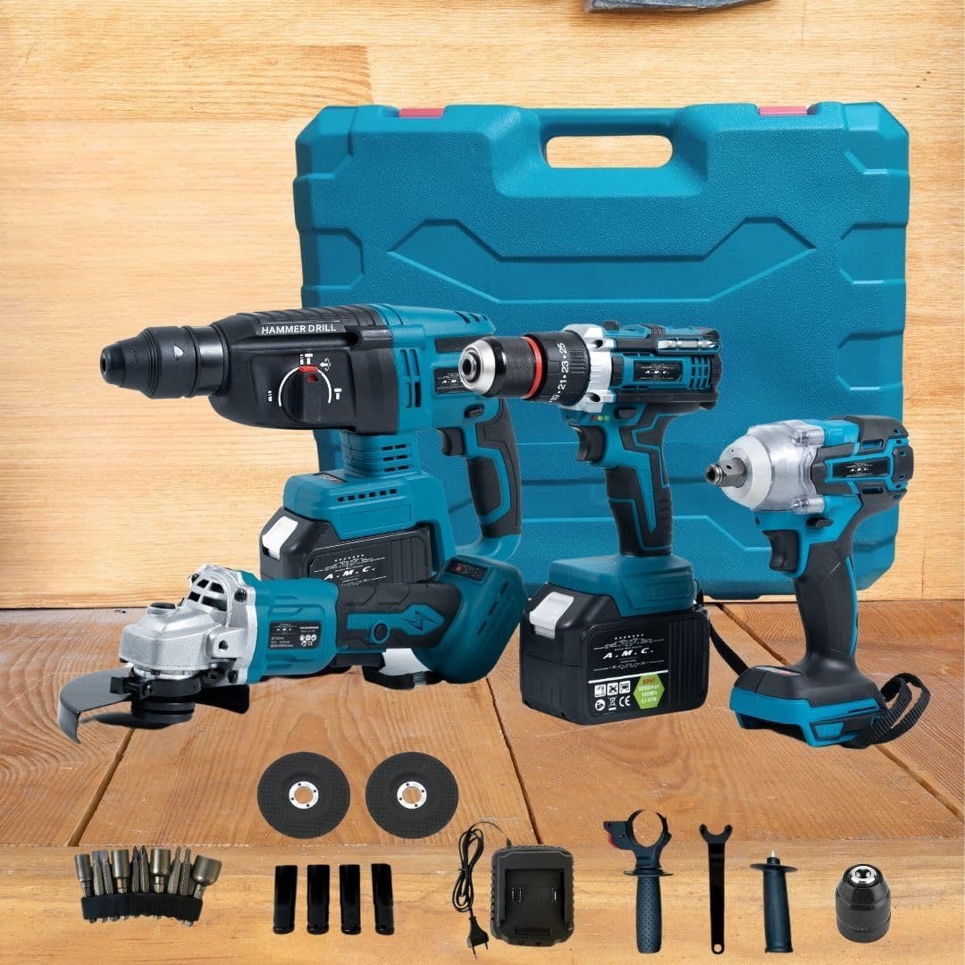Kit Professionale 4 in 1 con Tassellatore, Avvitatore, Smerigliatrice e Svitabulloni + 2 batterie ricaricabili,occhiali e guanti, caricabatterie + 14 accessori inclusi e custodia rigida. Tutto incluso, pronta all’uso.