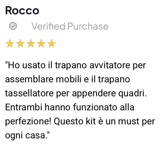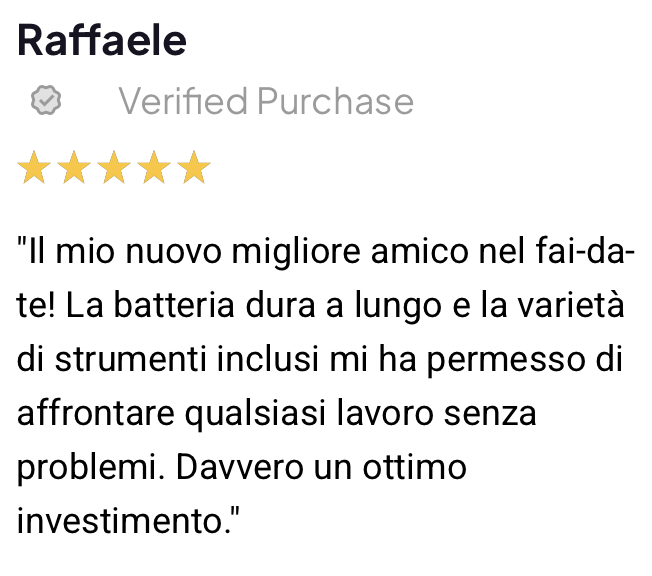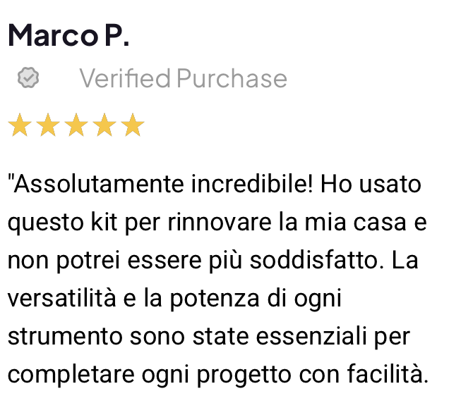 Grazie alla combinazione di quattro utensili essenziali in un unico set compatto, il Kit Utensili Elettrici è perfetto per artigiani, professionisti e amanti del fai da te che desiderano praticità, efficienza e prestazioni elevate in qualsiasi situazione.