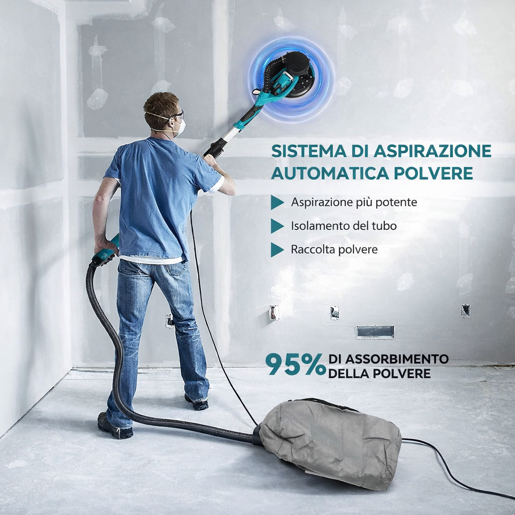 La nostra lucidatrice per pareti a secco è dotata di un raccoglitore di polvere, che dispone di un dispositivo di aspirazione integrato e una forte potenza di aspirazione e viene trasportato con un tubo flessibile al sacchetto di raccolta della polvere.