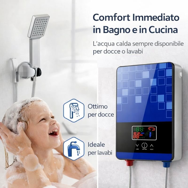 Acqua calda immediata senza boiler. Ideale per bagno, doccia e cucina, con consumi ridotti.
