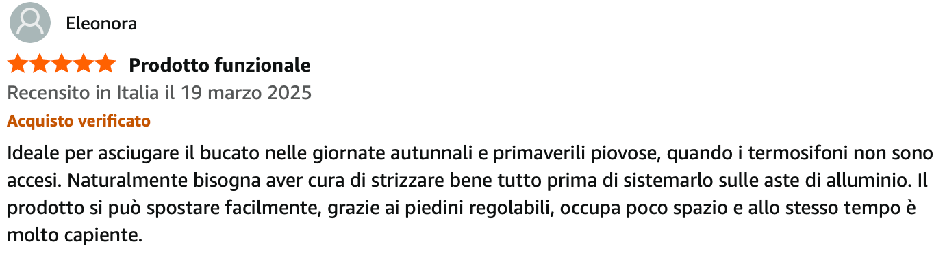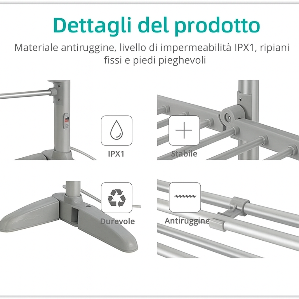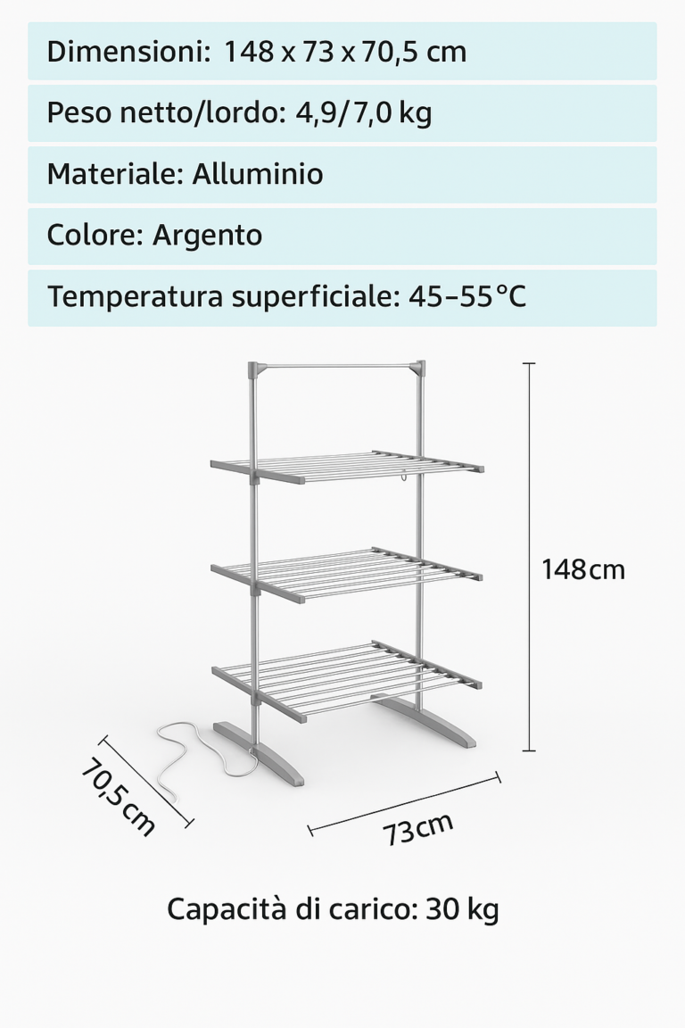 Dispone di 12 aste per stendere, è adatto a tutti i tipi di indumenti e supporta un massimo di 20 kg di bucato.
