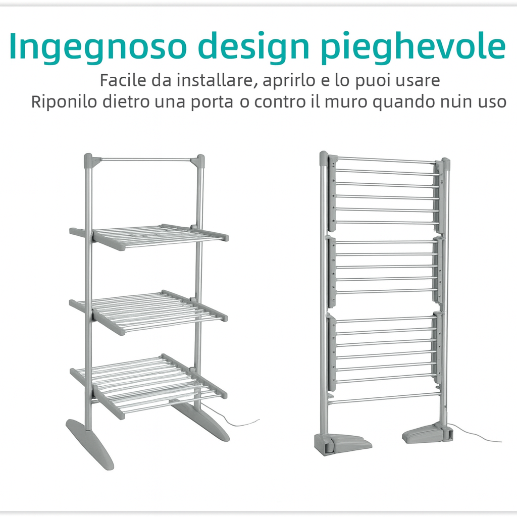 Dispone di 4 ali pieghevoli indipendenti che possono essere piegate o aperte individualmente, a seconda della quantità di vestiti.