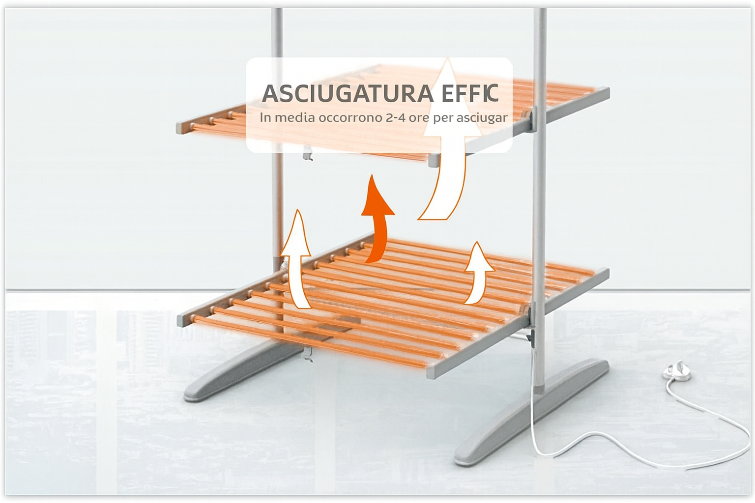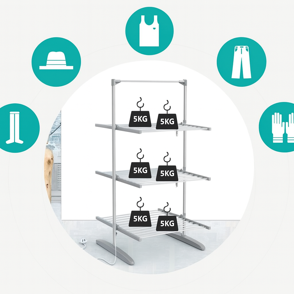 Questo stendibiancheria a basso consumo ha 24 W di potenza, che consente di risparmiare energia, in quanto il suo consumo elettrico è molto inferiore a quello di un’asciugatrice.
